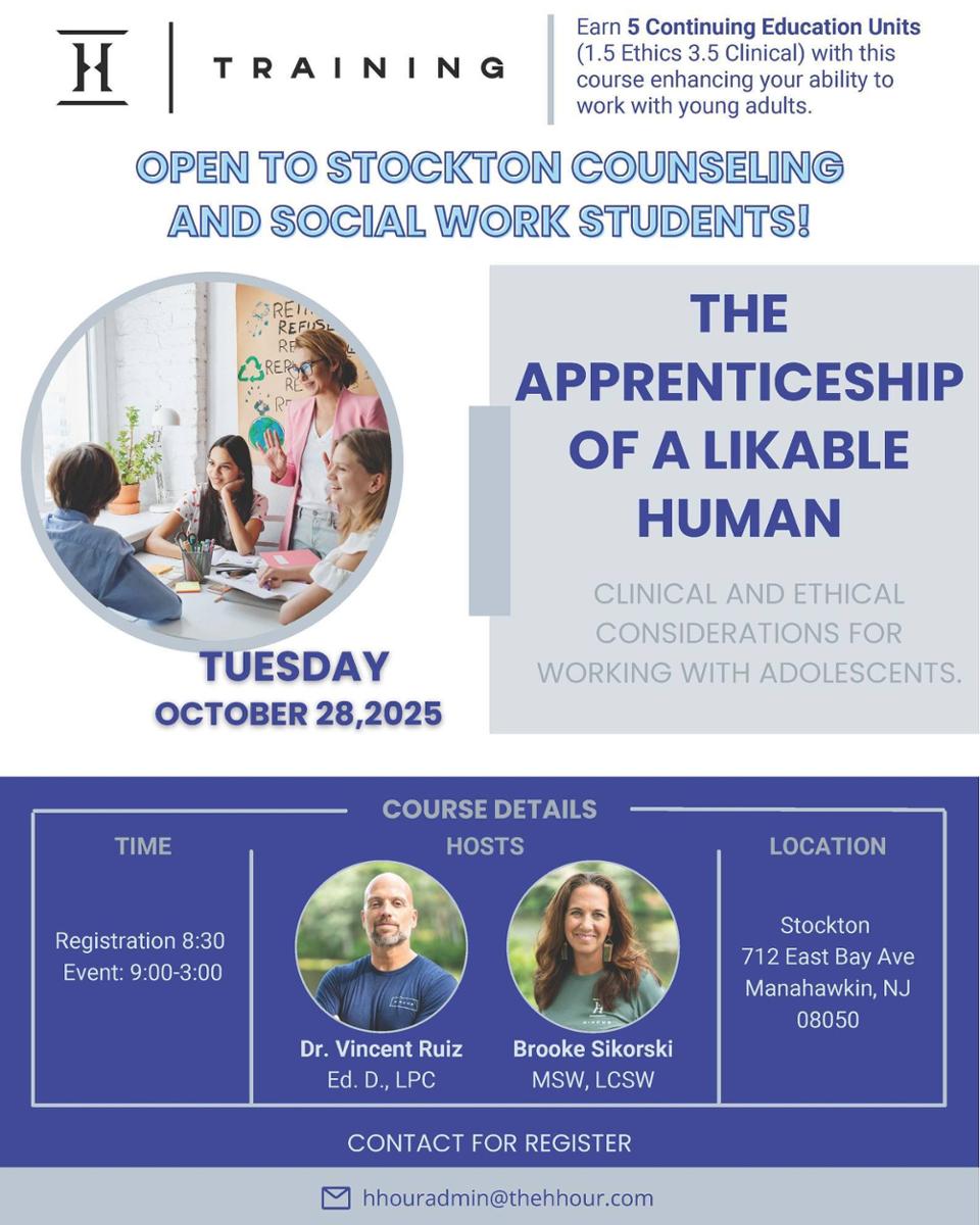 Professional Development opportunity for Counseling and Social Work professionals. Open to Stockton students! Register at hhouradmin@thehhour.com