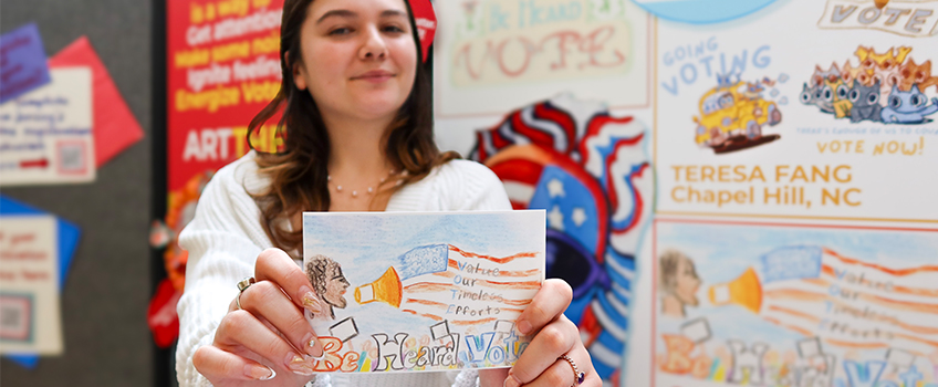 Political Science major Sarah Cirillo was among the winners of Art the Vote's summer competition. Her art, along with the competition’s other winners, promotes civic engagement through dynamic and multimedia art, which was displayed during the American Democracy Project's annual voter registration drive on Sept. 26.