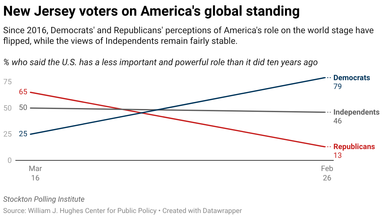 This same question was asked exactly 10 years ago in a Stockton poll. In 2016, 45% of New Jersey voters said the U.S. has a less important and powerful role compared to a decade ago, 21% said it had a more important and powerful role, and 32% said its standing had remained unchanged.