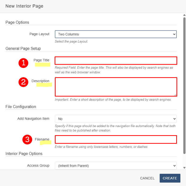 - Filename – Becomes part of your page’s web address. For example, typing creating-pages in this field produces the link: