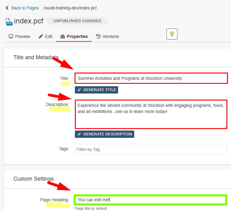 - Open Properties – With the page checked out, go to the Properties tab in the top-left area of the Edit View. Here you can update the title, description, and other page settings.